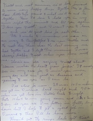 “Its 33 days now Violet [until the wedding]. I miss you very much and would sure like to be in Belleville right now. But as you say the time will soon slip by and we’ll be together. It will be like starting life anew like you said. Your a very swell girl Violet and I love you dearly and I don’t want to do anything to make you unhappy…If you were here I’d say pinch me to see if I’m dreaming.” [Bracket text added by author]